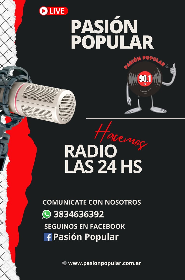 Desde el 23 de marzo de 2024, Pasión Popular 90.1 FM está al aire compartiendo la mejor música popular, tropical y del recuerdo, acompañando cada momento del día con buena energía, alegría y emoción. Somos una emisora 100% musical, nacida del amor por nuestras raíces, las voces del pueblo y las canciones que nos unen. Transmitimos en vivo para toda la región, llevando ritmo, noticias, entretenimiento y la participación de nuestra gente, que es el corazón de esta radio. Porque en Pasión Popular, cada oyente es parte de la familia. Nuestra programación combina lo mejor del pop latino, cumbia, cuarteto, folclore y clásicos de siempre, junto a locutores que te acompañan con buena onda, y novedades todos los días. Sintonizanos en 90.1 MHz FM o escuchanos online pasionpopular.com.ar desde cualquier lugar del mundo. Pasión Popular FM 90.1 — “Más que una radio… una forma de sentir.”